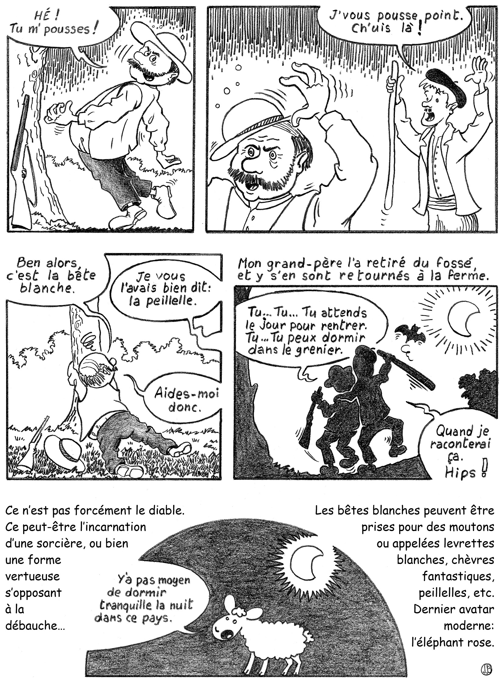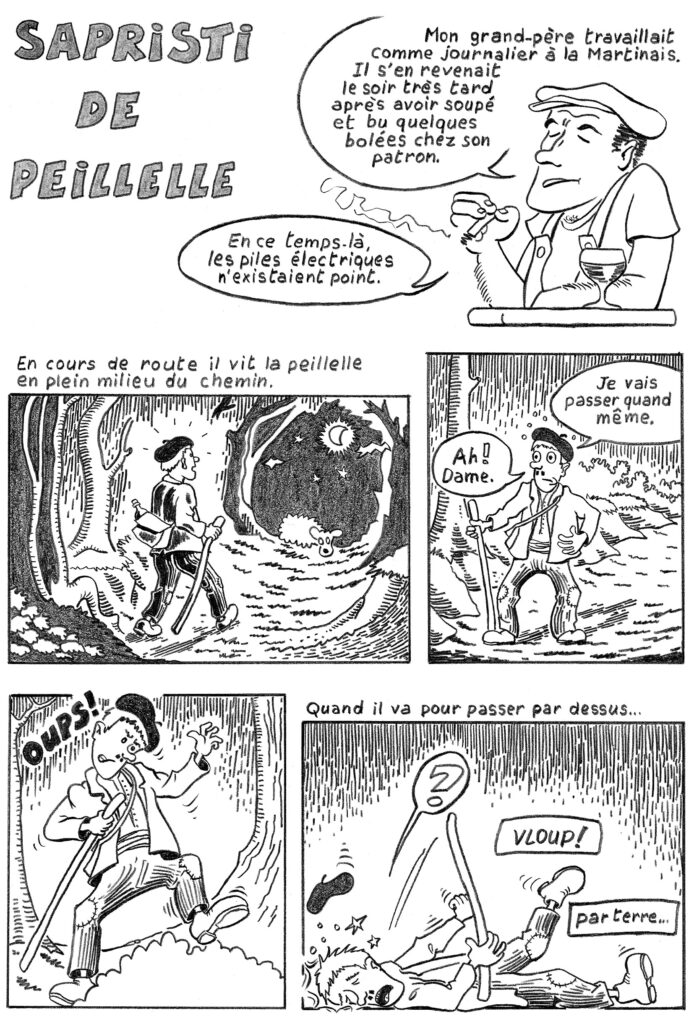 Cette histoire, adaptée en bande dessinée par Jean-Jacques Blain, se passait à Lohéac et est rapportée par Albert Poulain (1932-2015), un collecteur qui a œuvré en Ille-et-Vilaine. La peillelle est une des dénominations locales des « bêtes blanches », ces mauvais esprits apparaissant la nuit aux passants attardés dans toutes les contrées d’Ille-et-Vilaine. Tony Le Montréer, un érudit local, a relevé dans les années 1960 auprès d’habitants de la Gretais et de Maison-Blanche, à la limite d’Acigné et de Liffré, qu’un mouton apparaissait la nuit à la Croix des Pélerins, entre la Gretais et les Écures. Ces bêtes blanches vous attendent sur un talus ou une barrière le soir. Elles vous ennuient, vous bousculent.