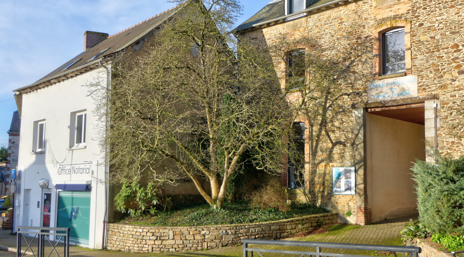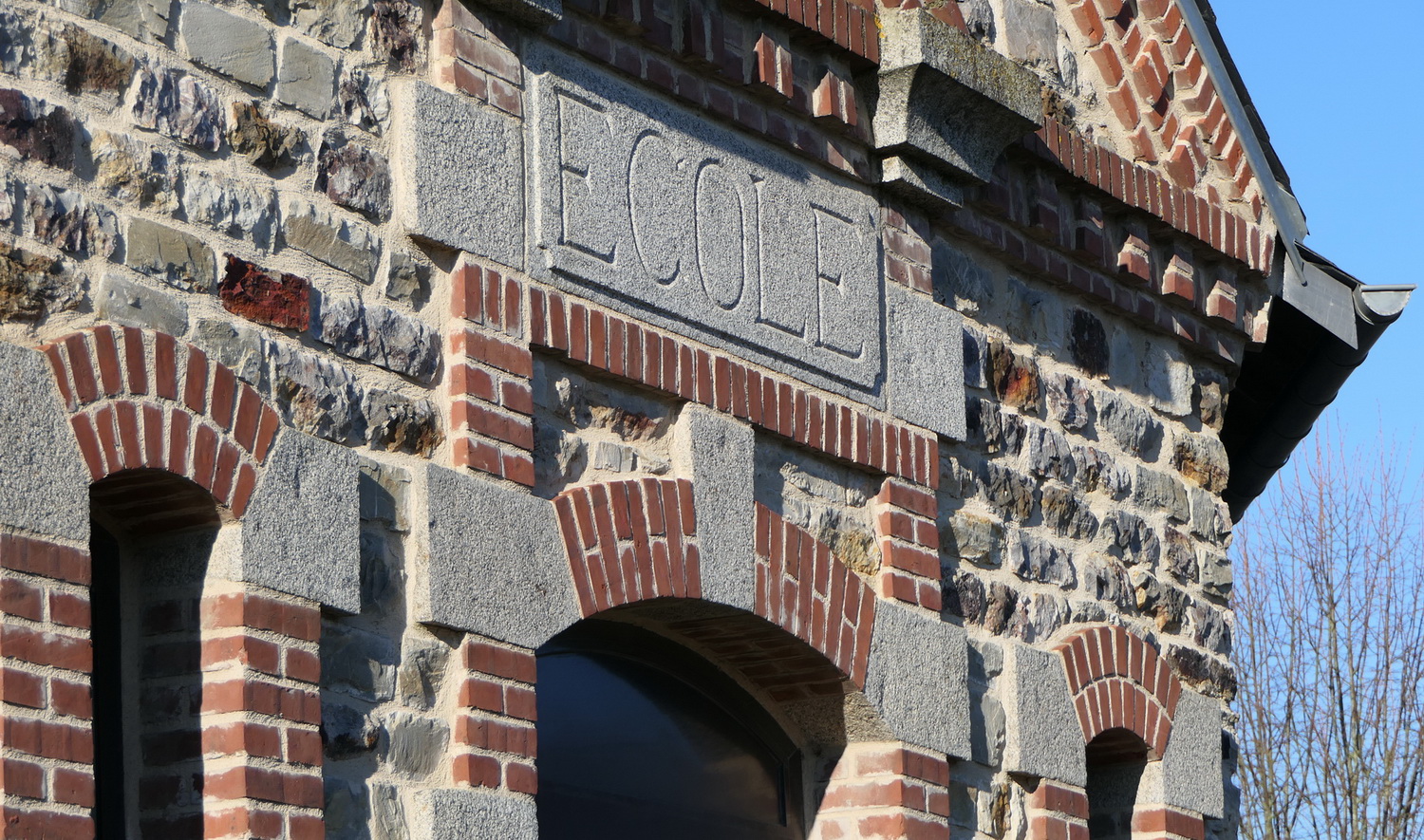 L’ancienne école communale, construite en 1892 est en pierre de grès. Comme tout le grès présent à Acigné, il vient très vraisemblablement de carrières situées à une dizaine de kilomètres, à Liffré et La Bouëxière. qui ont beaucoup servi pour les constructions de qualité en particulier entre 1850 et la Seconde guerre mondiale. L’encadrement de briques des ouvertures est typique des constructions autour des années 1900. Quant au granit taillé qui agrémente de manière originale ces encadrements, sans doute vient-il de la région de Fougères, où se trouve les plus proches carrières de cette pierre. Ce type de façade élaborée et composite, comme pour beaucoup d’écoles communales de l’époque, était une manière pour la République, encore jeune, de s’affirmer.