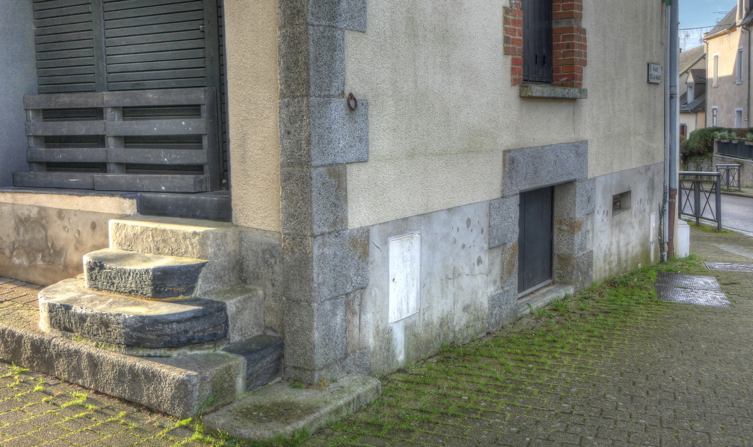 Cette habitation imposante, au coin de la place de la mairie et de la rue de Calais, avec ses chaînages d’angle en granit et ses encadrements de briques, date aussi de la fin du 19e ou du début du 20e siècle. Qui a-t-il sous le crépis ? Des moellons de grès car c’est l’époque. Les marches sont en schiste. Ce quartier des Clouères, bien que commençant à se densifier, était encore agricole et le porche permettait aux animaux et charrettes de transiter entre la rue et la cour derrière. On remarque d’ailleurs un anneau pour attacher les chevaux à l’entrée du porche. L’entrée d’accès au sous-sol en façade, qui était certainement plus profonde avec des marches pour y descendre, permettait d’y glisser des barriques de cidres, des réserves de bois de chauffage, etc.