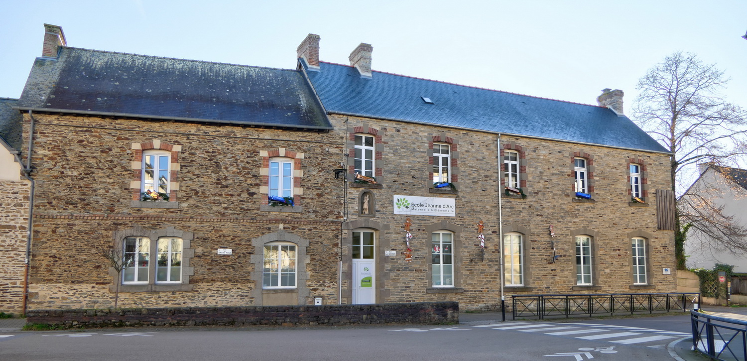 L’école Jeanne d’Arc, en grès et avec des encadrements en granit et en briques, a été construite en deux temps, autour de 1900. La partie de gauche est un peu plus ancienne, avec des moellons bruts sortie de carrière, alors que pour la partie de droite, plus récente, les blocs sont taillés.