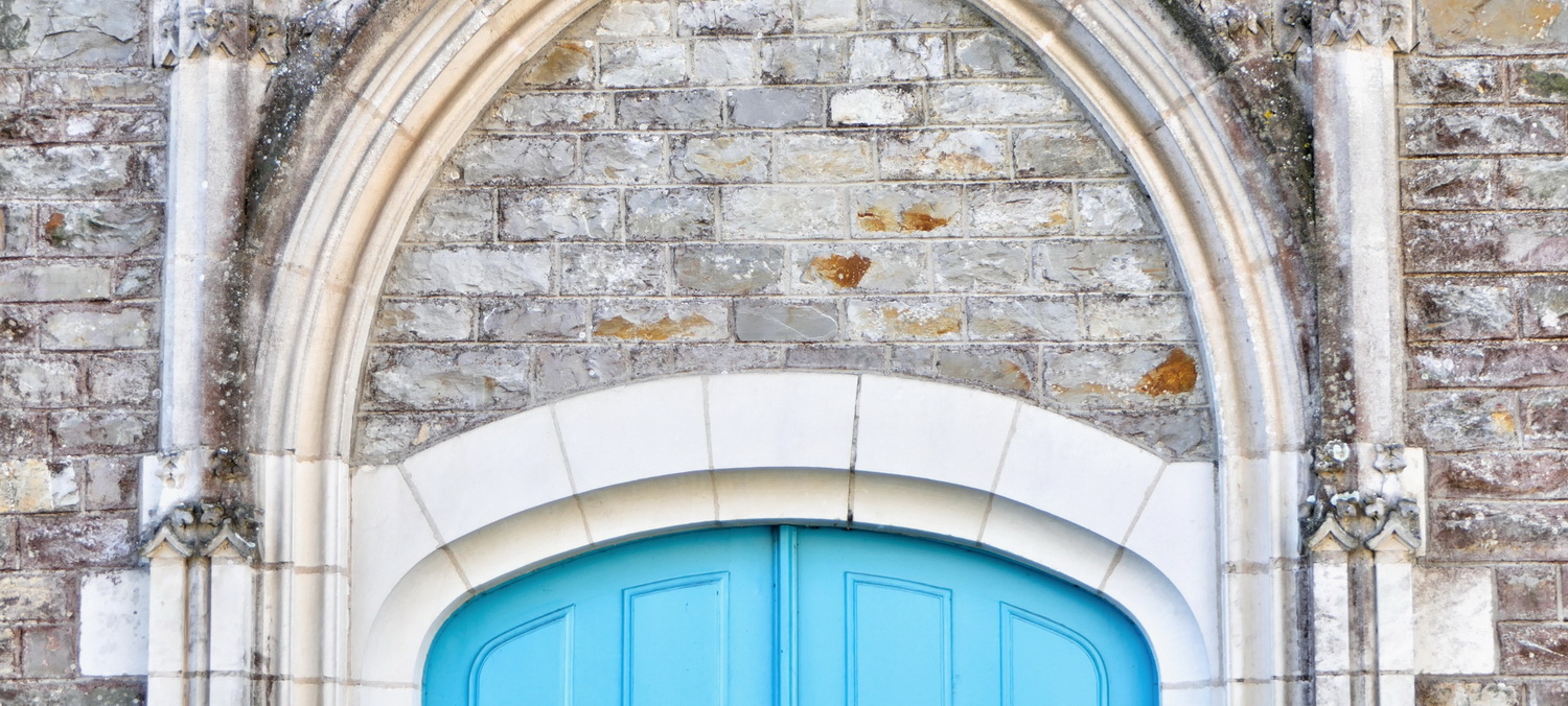 L’église a été construite en 1904, essentiellement en grès, venant comme le plus souvent à Acigné des carrières de Liffré et La Bouëxière. Pour les encadrements d’ouverture on avait une sorte de hiérarchie dans cette période: la brique c’est bien, le granit, c’est encore mieux et le tuffeau c’est le nec plus ultra. La couleur blanche de cette pierre calcaire et la possibilité de la sculpter finement en fait un matériau de choix pour les éléments décoratifs. Dans notre région le tuffeau vient soit de la région de Caen, soit du Val de Loire. Mais sa surface s’altère progressivement, surtout à l’extérieur, nécessitant des opérations de restauration, comme ici pour l’encadrement de la porte.