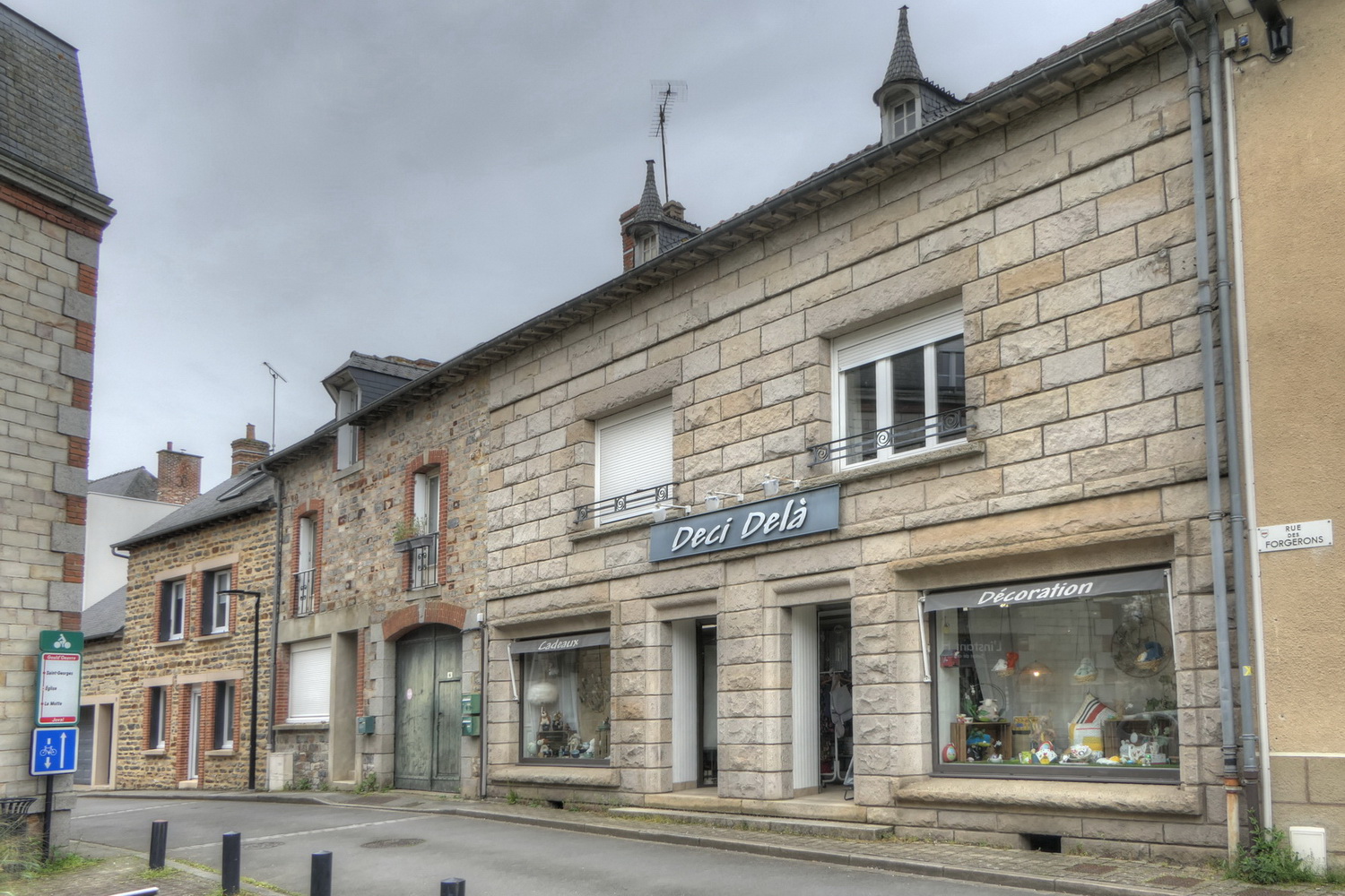 Au n°6 de la rue des Forgerons, une façade en granit. le mur de façade, comme le reste de la maison était à l’origine en bauge. Victime d’infiltrations d’eau, un jour de 1953 la façade s’est écroulée brutalement, le reste du bâtiment résistant. Le mur de façade a été remplacé par un mur en granit de qualité permettant d’ouvrir les larges baies de ce commerce. Un rare exemple à Acigné d’usage exclusif de cette pierre.