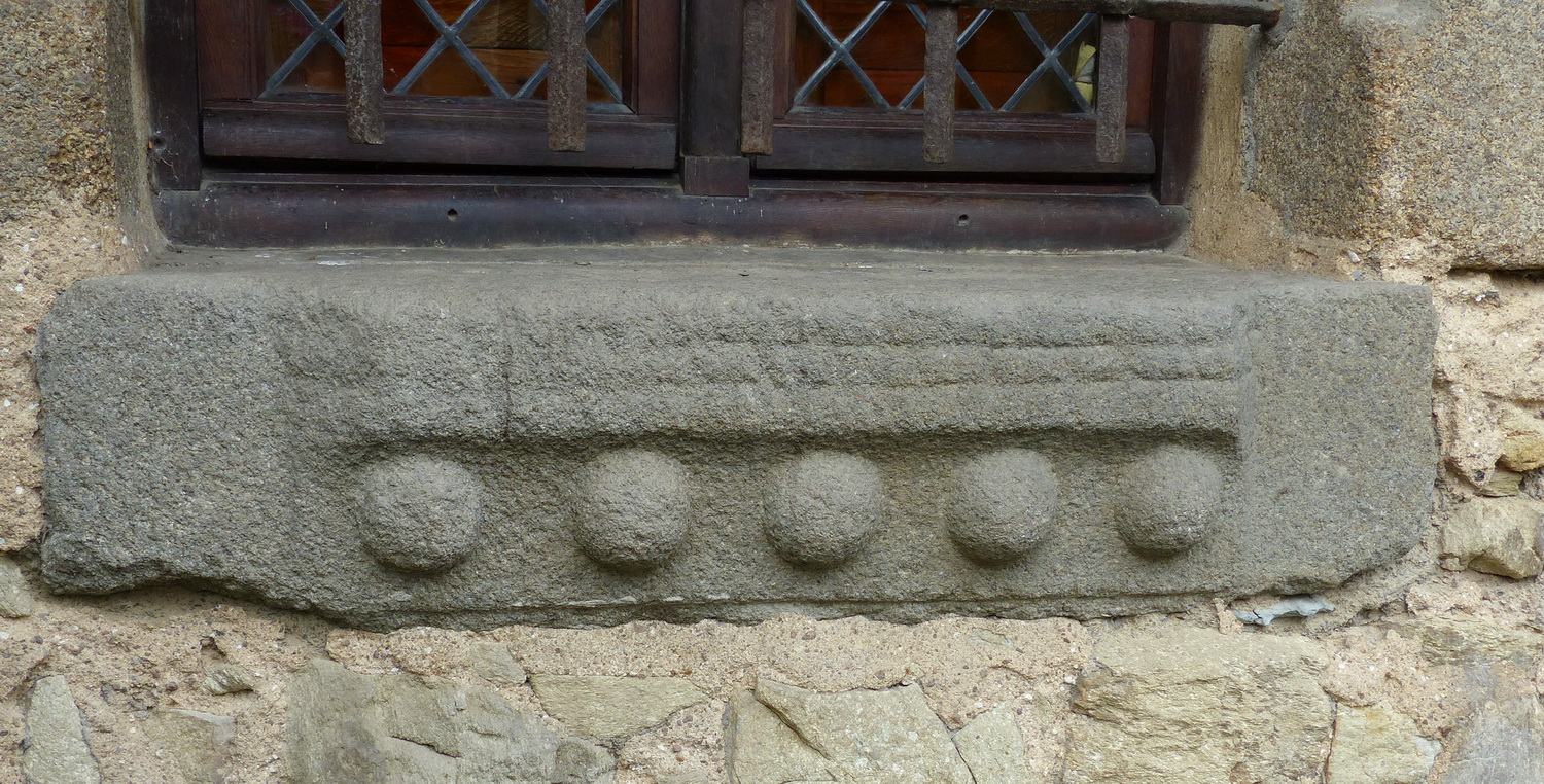 Toujours sur la maison du 16e siècle, des boules sculptées dans le rebord de la fenêtre. Elles étaient réputées protéger de la peste (par analogie avec les bubons, une des manifestations de la maladie). Est-ce l’origine de cette décoration ? En tout cas, au 16e siècle, la peste faisait toujours partie du paysage sanitaire et des angoisses des contemporains.