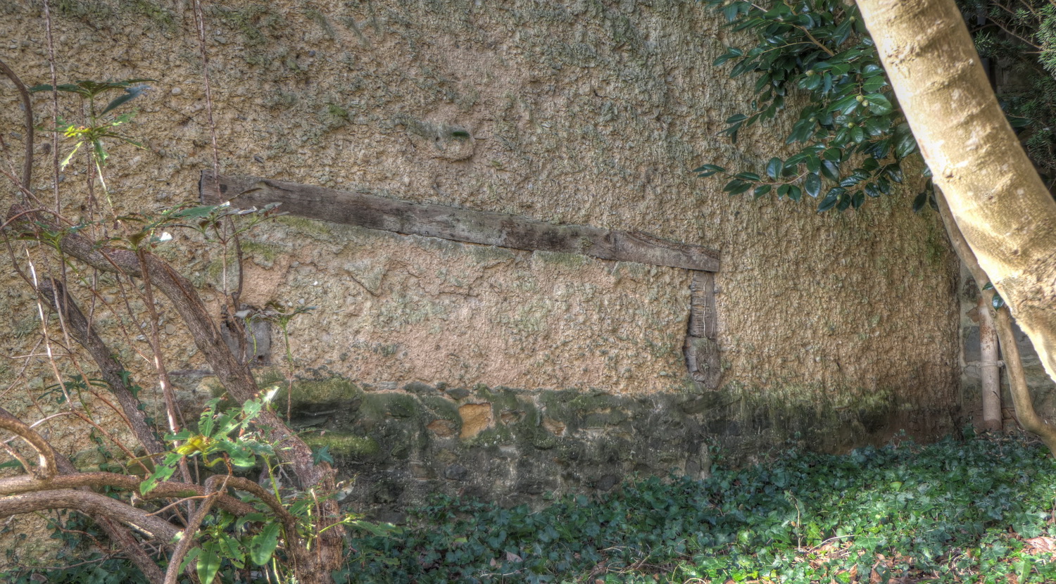 Le pignon du n° 12 de la rue de Calais avec le bauge apparent. Le solin (la base du mur) est en schiste du pays, afin de limiter les remontées d’humidité dans le mur en terre. Les poutres qui apparaissent au dessus correspondent au cadre d’une ancienne cheminée. Beaucoup de maisons du bourg sont en bauge. Quand on voit la façade de cette maison, l’office notarial aujourd’hui, on ne le soupçonnerait pas, mais sous le crépis, ici en ciment, le mur est bien en terre.