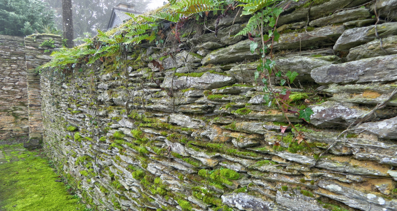 Le décrochage des murs entre les numéros 11 et 13 de la rue Saint-Georges et son schiste infiltré d’oxyde de fer. Bien que local aussi, sans doute, il est de meilleure qualité que le schiste du mur du jardin du presbytère. Le sous-sol d’Acigné est en effet constitué d’un alternance de schistes briovériens assez durs ou, à l’inverse, plus tendres.